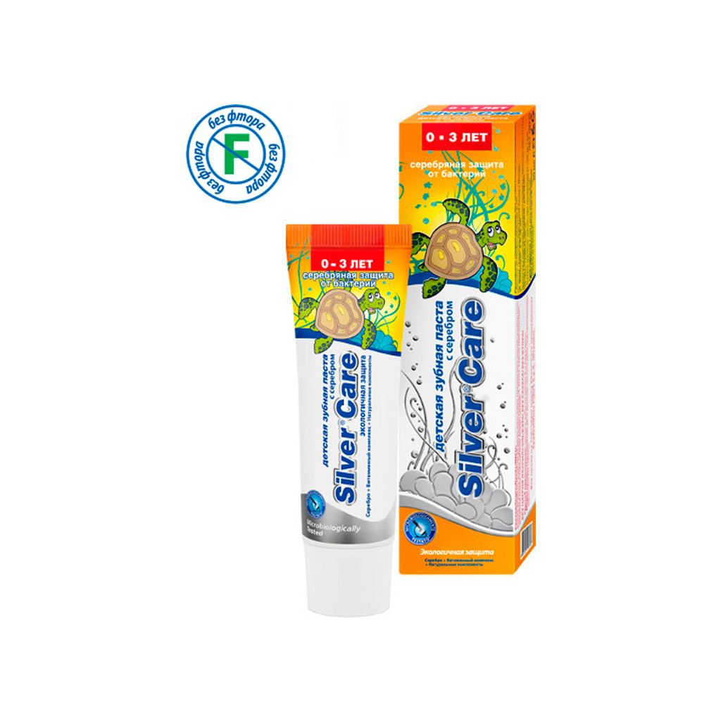 Зубная паста Silver Care для детей от 0 до 3 лет содержит натуральные компоненты и безопасна при проглатывании.