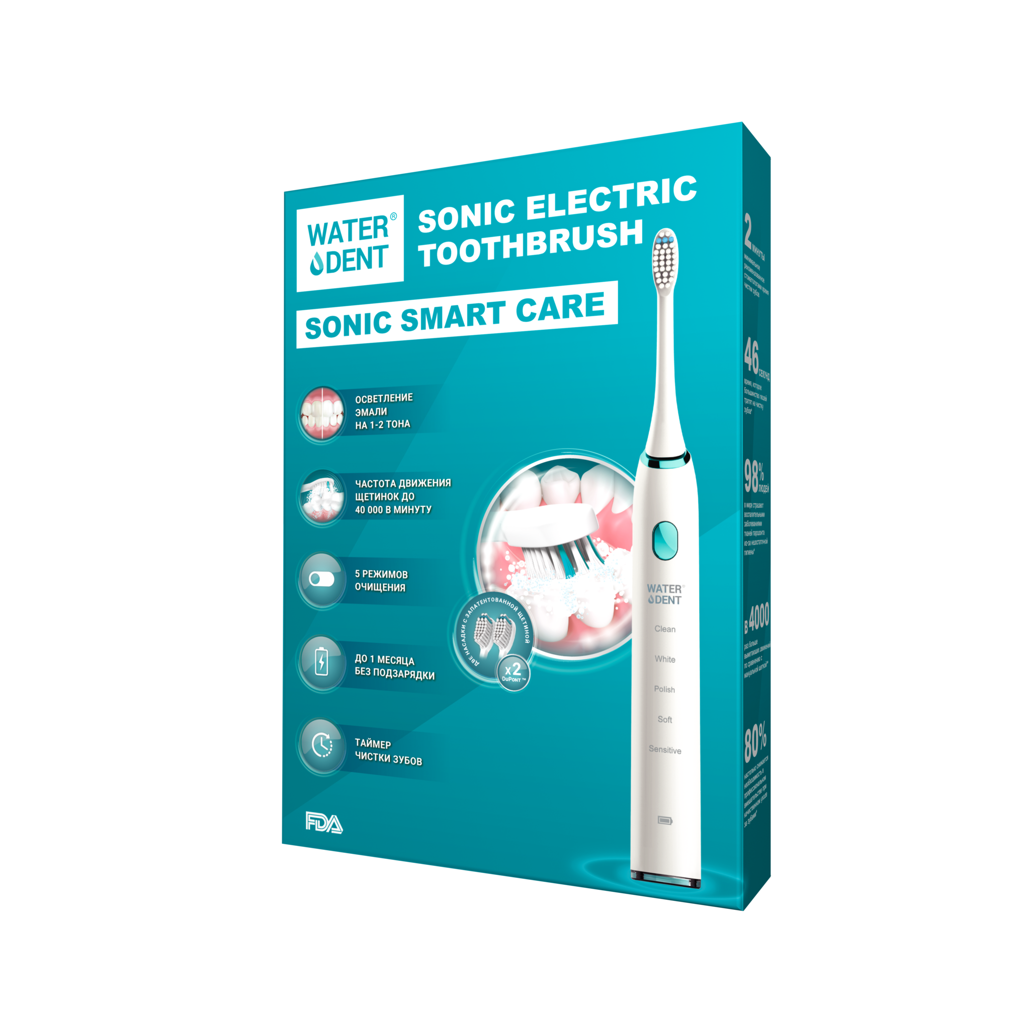 Звуковая щетка с запатентованной щетиной DuPont и 5 режимами работы качественно очищает эмаль.